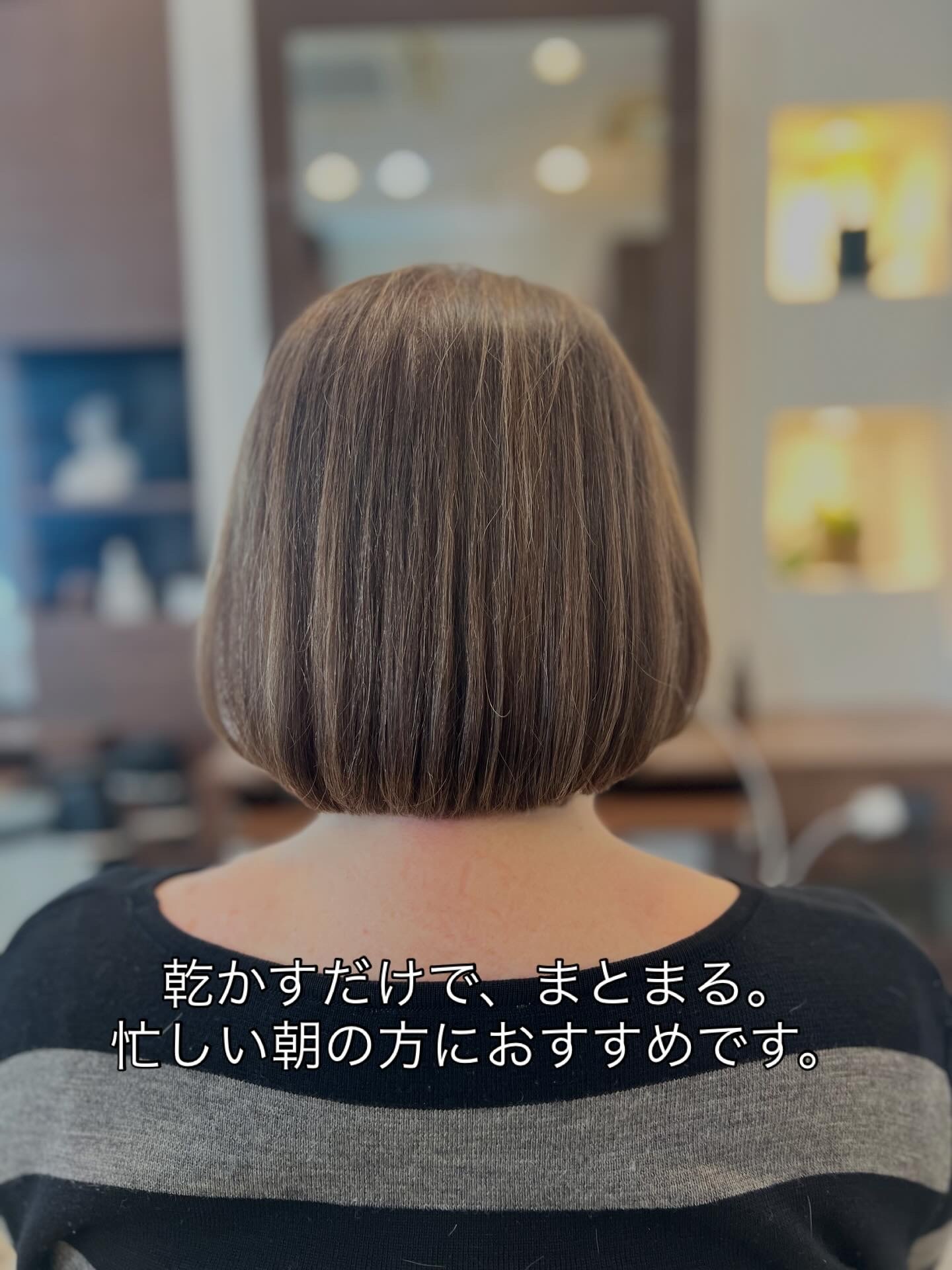 段差を抑えたシンプルボブなら、乾かすだけで面が整い、品のあるまとまりが手に入ります。