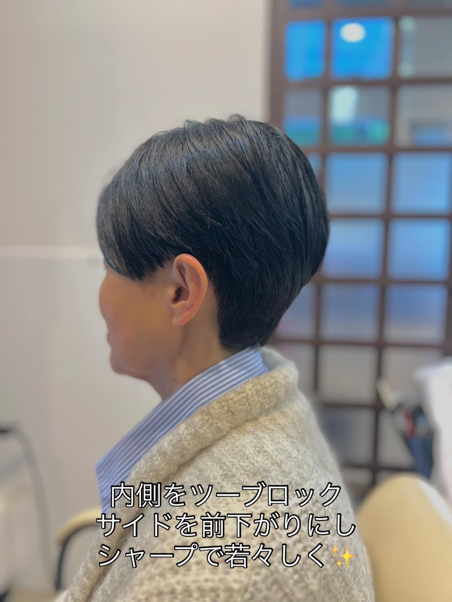 刈りすぎないツーブロックと前下がりカットで、女性らしさと残しつつシャープに若々しく整えます。