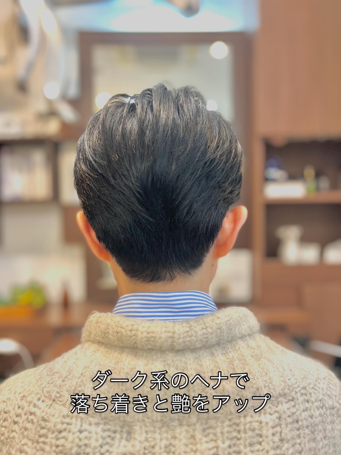 ダーク系のジアミン入りヘナを使用し、事前にパッチテストで反応を確認。