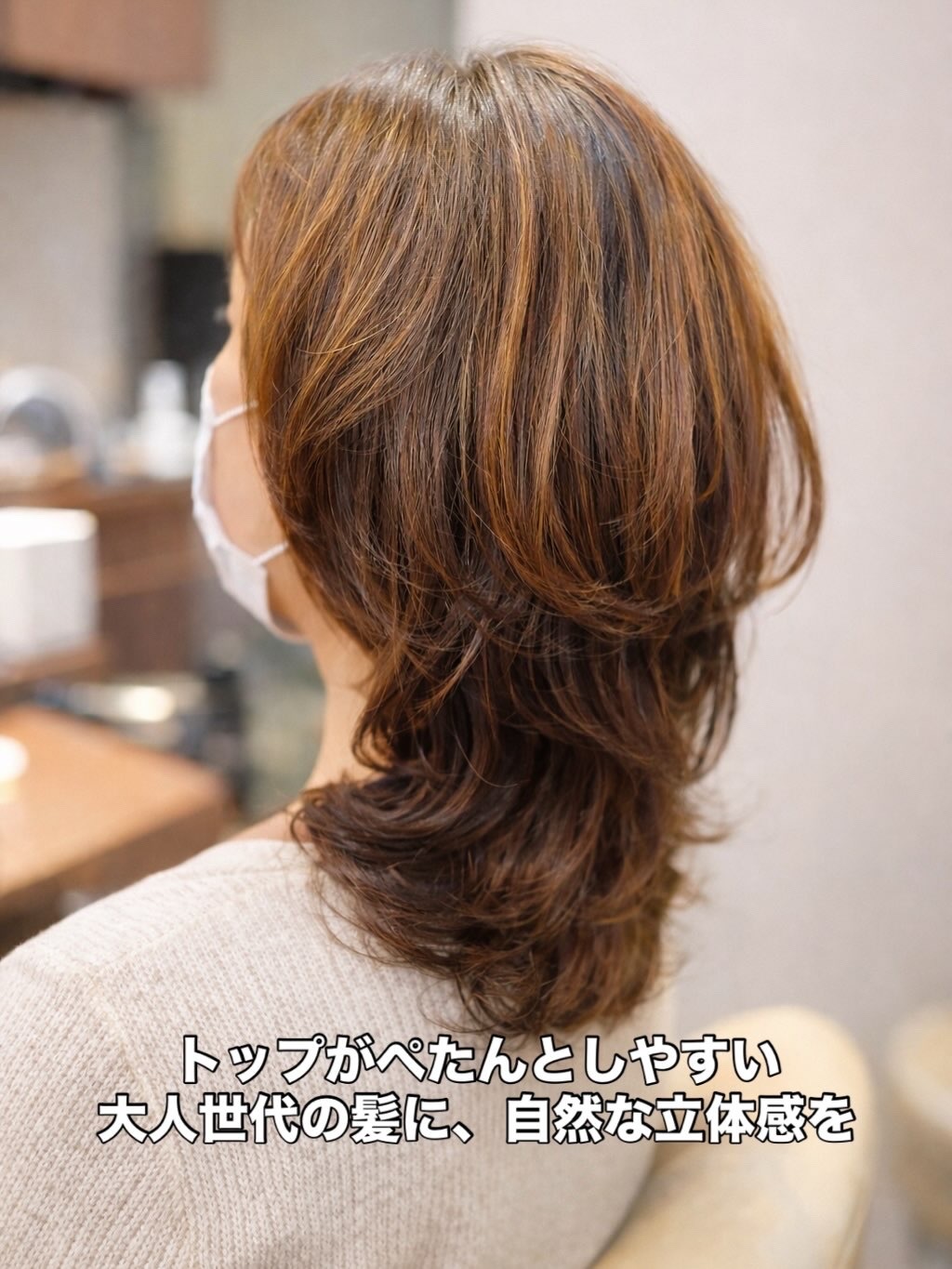 トップがペたんとしやすい大人世代の髪に、自然な立体感を